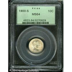 1900-S 10C MS64 PCGS. Whispers of gold-brown color <B>1900-S 10C MS64 PCGS.</B></I> Whispers of gold-brown color visit lustrous surfaces that exhibit well struck devices. This piece generates considerable eye appeal. <BR><BR><B>Important notice:</B> Heritage usually auctions material at the rate of 200-250 lots per hour. On some occasions eBay Live bid software or the Internet may not be able to keep up with the pace of the auction. We recommend placing a realistic absentee bid now as insurance to avoid disappointment. Occasionally the auctioneer may eliminate or reject an eBay Live bid, and the auctioneer may also reopen a lot after the close of the eBay live bidding (usually because we missed an audience bid), and may reject your bid even if it shows you as the winning bidder. By bidding via eBay Live, you agree that Heritage may award the lot to another bidder at its sole discretion under the circumstances described above or any other reasonable circumstances. Since eBay bids are not shown to us until we open the lot on the floor, we treat those bids just like floor bids. In most cases the floor responds before the eBay bid is presented to us, due to Internet lag time, so for consistency we have made it a policy that floor bids are always considered first over tie eBay live bids. Also please note that all Heritage lots purchased through eBay Live carry a 20% Buyer's Premium. Please make sure you read the Terms and Conditions before you bid. This lot is being auctioned in conjunction with a live floor auction by Heritage Galleries & Auctioneers. All final auction and invoice information will be supplied by Heritage Galleries & Auctioneers, and all other information should be considered preliminary. Lot:5768