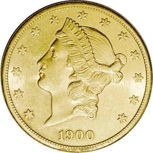 1900-S $20 AU58 NGC. Faint slide marks above the date 1900-S[$20] AU58 NGC.