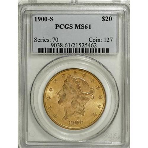 <B>1900-S $20 MS61 PCGS.</B></I> PCGS Population (1103/2193). NGC Census: (1960/2569). Mintage: 2,459,500. Numismedia Wsl. Price for NGC/PCGS coin in MS61: $705. (#9038)<BR><BR><B>Coin Engraver:</B> James B. Longacre<BR><BR><b>Shipping:</b> Coins & Currency (<a target="_blank" href="http://www.heritageauctions.com/common/shipping.php">view shipping information</a>)
