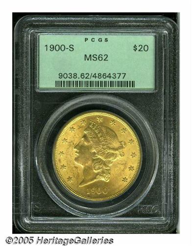 <B>1900-S<$20> MS62 PCGS.</B></I> This turn of the century Double Eagle has dazzling luster and a decent strike. The absence of heavy marks ensures the quality of this older holder representative.
