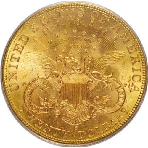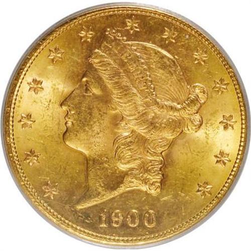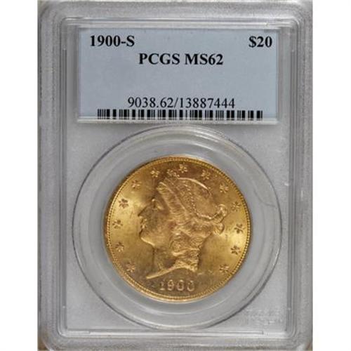 <B>1900-S $20 MS62 PCGS.</B></I> PCGS Population (1366/754). NGC Census: (1907/643). Mintage: 2,459,500. Numismedia Wsl. Price for NGC/PCGS coin in MS62: $755. (#9038)<BR><BR><B>Coin Engraver:</B> James B. Longacre<BR><BR><b>Shipping:</b> Coins & Currency (<a target="_blank" href="http://www.heritageauctions.com/common/shipping.php">view shipping information</a>\)