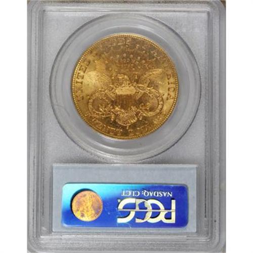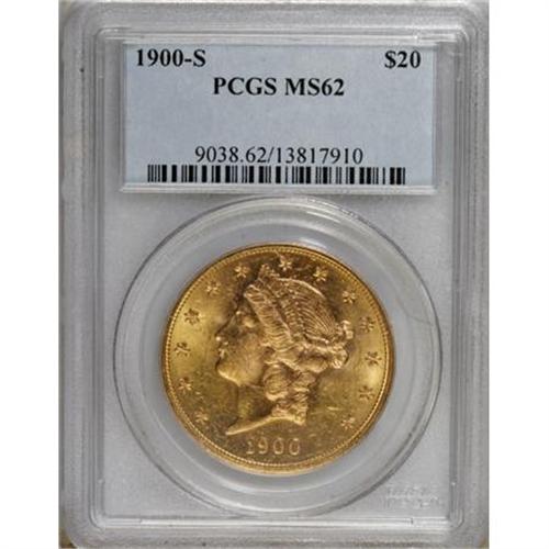 <B>1900-S $20 MS62 PCGS.</B></I> PCGS Population (1388/777). NGC Census: (1912/650). Mintage: 2,459,500. Numismedia Wsl. Price for NGC/PCGS coin in MS62: $740. (#9038)<BR><BR><B>Coin Engraver:</B> James B. Longacre<BR><BR><b>Shipping:</b> Coins & Currency (<a target="_blank" href="http://www.heritageauctions.com/common/shipping.php">view shipping information</a>)