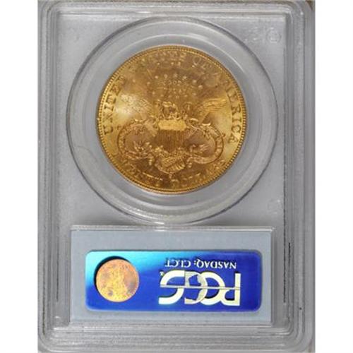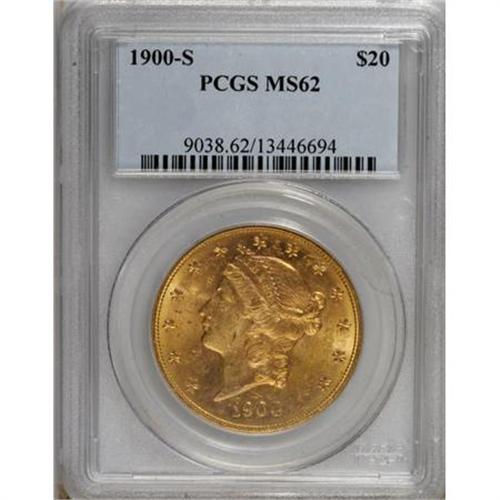 <B>1900-S $20 MS62 PCGS.</B></I> PCGS Population (1409/781). NGC Census: (1918/651). Mintage: 2,459,500. Numismedia Wsl. Price for NGC/PCGS coin in MS62: $740. (#9038)<BR><BR><B>Coin Engraver:</B> James B. Longacre<BR><BR><b>Shipping:</b> Coins & Currency (<a target="_blank" href="http://www.heritageauctions.com/common/shipping.php">view shipping information</a>)