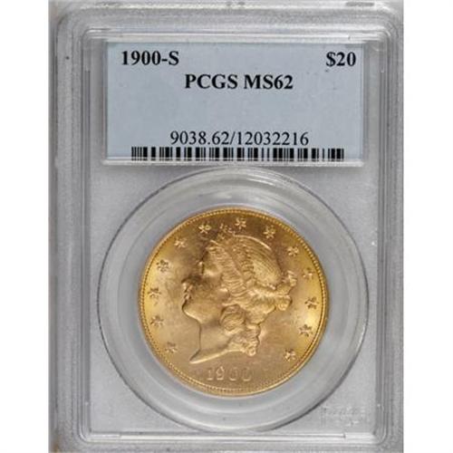 <B>1900-S $20 MS62 PCGS.</B></I> PCGS Population (1433/796). NGC Census: (1915/655). Mintage: 2,459,500. Numismedia Wsl. Price for NGC/PCGS coin in MS62: $740. (#9038)<BR><BR><B>Coin Engraver:</B> James B. Longacre<BR><BR><b>Shipping:</b> Coins & Currency (<a target="_blank" href="http://www.heritageauctions.com/common/shipping.php">view shipping information</a>)
