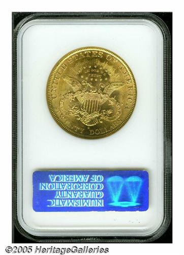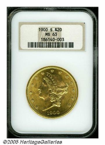 <B>1900-S<$20> MS63 NGC.</B></I> Well struck with exceedingly bright, frosty luster, sparkling cartwheel effects in the fields, and beautiful green-gold toning. Minor scuffiness, mainly on the obverse, limits the grade.