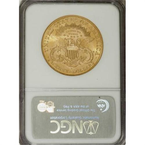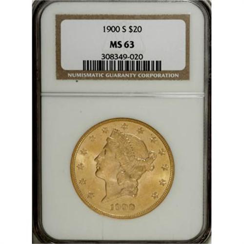 <B>1900-S $20 MS63 NGC.</B></I> Boldly struck with exceedingly flashy, frosty mint luster on both sides, and dazzling cartwheel splendor in the fields. Rich golden-orange toning adorns each side of the piece, and the surfaces display a modest number of small to medium-sized abrasions for the MS63 grade level.<BR><BR><B>Coin Engraver:</B> James B. Longacre<BR><BR><b>Shipping:</b> Coins & Currency (<a target="_blank" href="http://www.heritageauctions.com/common/shipping.php">view shipping information</a>\)