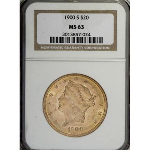 <B>1900-S $20 MS63 NGC.</B></I> . NGC Census: (573/85). PCGS Population (708/99). Mintage: 2,459,500. Numismedia Wsl. Price for NGC/PCGS coin in MS63: $1,675. (#9038)<BR><BR><B>Coin Engraver:</B> James B. Longacre<BR><BR><b>Shipping:</b> Coins & Currency (<a target="_blank" href="http://www.heritageauctions.com/common/shipping.php">view shipping information</a>)