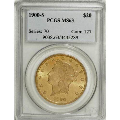 <B>1900-S $20 MS63 PCGS.</B></I> Lime-gold and peach shadings confirm the originality. Evenly struck with unencumbered luster. Smooth for the grade aside from abrasions near the mintmark. <BR><BR><B>Coin Engraver:</B> James B. Longacre<BR><BR><b>Shipping:</b> Coins & Currency (<a target="_blank" href="http://www.heritageauctions.com/common/shipping.php">view shipping information</a>)