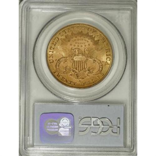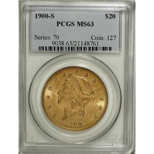 <B>1900-S $20 MS63 PCGS.</B></I> A crisply struck and enticing Select piece from the final year of the 19th century, strongly lustrous with hints of peach on the apricot-gold surfaces. Light, scattered marks preclude a finer designation.<BR><BR><B>Coin Engraver:</B> James B. Longacre<BR><BR><b>Shipping:</b> Coins & Currency (<a target="_blank" href="http://www.heritageauctions.com/common/shipping.php">view shipping information</a>)