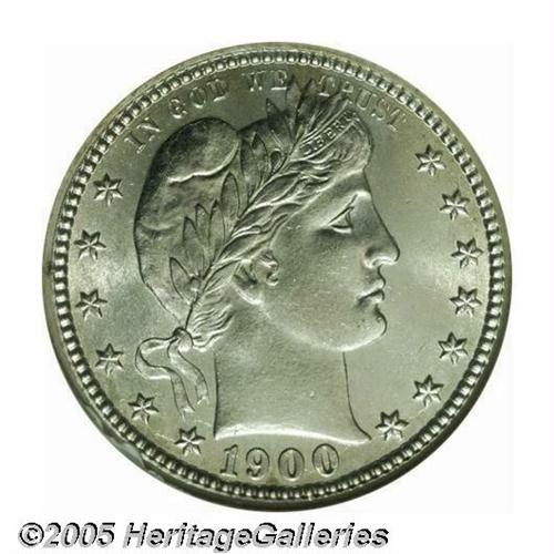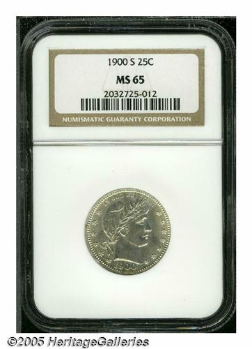 <B>1900-S<25C> MS65 NGC.</B></I> A heavily exported issue that, despite multiple appearances in this sale, is extremely scarce in Gem and better grades. This bright, satiny representative is essentially untoned and displays spindly die cracks along the right obverse periphery. Population: 3 in 65, 7 finer (3/05).