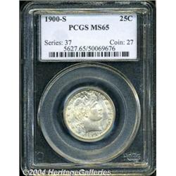 <B>1900-S<25C> MS65 PCGS.</B></I> The 1900-S was produced to the extent of 1.8 million pieces, a relatively limited number for a turn-of-the-century silver issue. Most of these coins entered circulation, and MS65 representatives are few and far between on today's market. A lightly patinated silver-gray Gem with excellent definition over the devices and virtually no noticeable blemishes. A sharply struck coin for the advanced Barber quarter collector. Population: 5 in 65, 6 finer (3/04).<BR><I>Ex: FUN Signature Sale (Heritage, 1/04), lot 6081, which realized $3,910.</B></I><BR><I>From the JFS Collection.</B></I> <BR><BR><B>Important notice:</B> Heritage usually auctions material at the rate of 200-250 lots per hour. On some occasions eBay Live bid software or the Internet may not be able to keep up with the pace of the auction. We recommend placing a realistic absentee bid now as insurance to avoid disappointment. Occasionally the auctioneer may eliminate or reject an eBay Live bid, and the auctioneer may also reopen a lot after the close of the eBay live bidding (usually because we missed an audience bid), and may reject your bid even if it shows you as the winning bidder. By bidding via eBay Live, you agree that Heritage may award the lot to another bidder at its sole discretion under the circumstances described above or any other reasonable circumstances. Since eBay bids are not shown to us until we open the lot on the floor, we treat those bids just like floor bids. In most cases the floor responds before the eBay bid is presented to us, due to Internet lag time, so for consistency we have made it a policy that floor bids are always considered first over tie eBay live bids. Also please note that all Heritage lots purchased through eBay Live carry a 20% Buyer's Premium. Please make sure you read the Terms and Conditions before you bid. </span></font></tr></table></td></tr></table>