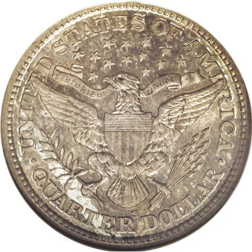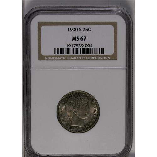 <B>1900-S<25C> MS67 NGC.</B></I> A gorgeous coin that is enhanced by delicate sea-green and deep antique-gold toning throughout. Luster resides in the fields, and the surfaces are outstanding as expected for the grade. Identifiable by a minor tick on the cheek just behind Liberty's nostril. For this date and mint the strike is exceptional with no sign of weakness seen, even the eagle's claws and the arrow feathers all of which are bold. Importantly, the combined NGC and PCGS Population reports show six coins graded this high, with none seen finer of this date (6/06).<BR><I>From The Belle Glade Collection.</B></I> <BR><BR><B>Important