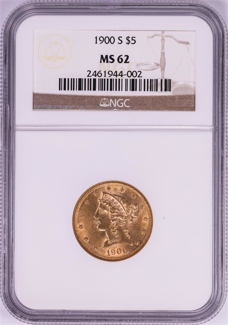 One 1900-S $5 Liberty Head Half Eagle Gold Coin NGC MS62. NGC Certified.