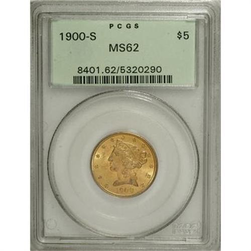 <B>1900-S $5 MS62 PCGS.</B></I> PCGS Population (81/381). NGC Census: (78/130). Mintage: 329,000. Numismedia Wsl. Price for NGC/PCGS coin in MS62: $416. (#8401)<BR><BR><B>Coin Engraver:</B> Christian Gobrecht<BR><BR><b>Shipping:</b> Coins & Currency (<a target="_blank" href="http://www.heritageauctions.com/common/shipping.php">view shipping information</a>)