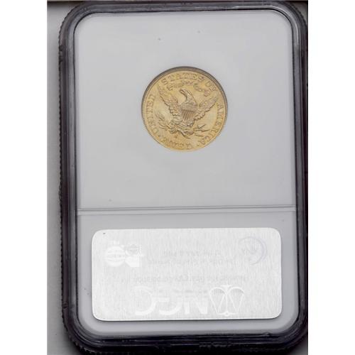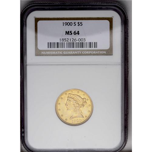 <B>1900-S<$5> MS64 NGC.</B></I> Lustrous apricot-gold surfaces exhibit grayish-green accents and sharply delineated design elements. A few minute marks define the grade. The 1900-S is quite rare above the MS64 grade level.