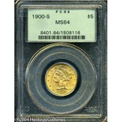 1900-S $5 MS64 PCGS. A sharply struck and lustrous <B>1900-S $5 MS64 PCGS.</B></I> A sharply struck and lustrous example with bright honey color and no disturbing marks. Rare any finer, and housed in a green label holder. <BR><BR><B>Important notice:</B> Heritage usually auctions material at the rate of 200-250 lots per hour. On some occasions eBay Live bid software or the Internet may not be able to keep up with the pace of the auction. We recommend placing a realistic absentee bid now as insurance to avoid disappointment. Occasionally the auctioneer may eliminate or reject an eBay Live bid, and the auctioneer may also reopen a lot after the close of the eBay live bidding (usually because we missed an audience bid), and may reject your bid even if it shows you as the winning bidder. By bidding via eBay Live, you agree that Heritage may award the lot to another bidder at its sole discretion under the circumstances described above or any other reasonable circumstances. Since eBay bids are not shown to us until we open the lot on the floor, we treat those bids just like floor bids. In most cases the floor responds before the eBay bid is presented to us, due to Internet lag time, so for consistency we have made it a policy that floor bids are always considered first over tie eBay live bids. Also please note that all Heritage lots purchased through eBay Live carry a 20% Buyer's Premium. Please make sure you read the Terms and Conditions before you bid. This lot is being auctioned in conjunction with a live floor auction by Heritage Galleries & Auctioneers. All final auction and invoice information will be supplied by Heritage Galleries & Auctioneers, and all other information should be considered preliminary. Lot:6682