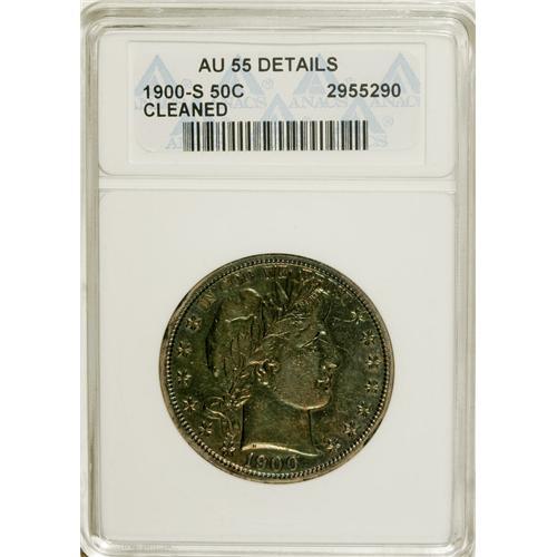 <B>1900-S 50C --Cleaned--ANACS. AU55 Details.</B></I> NGC Census: (18/80). PCGS Population (15/54). Mintage: 2,560,322. Numismedia Wsl. Price for NGC/PCGS coin in AU55: $279. (#6488)<BR><BR><b>Shipping:</b> Coins & Currency (<a target="_blank" href="http://www.heritageauctions.com/common/shipping.php">view shipping information</a>)