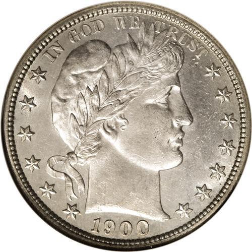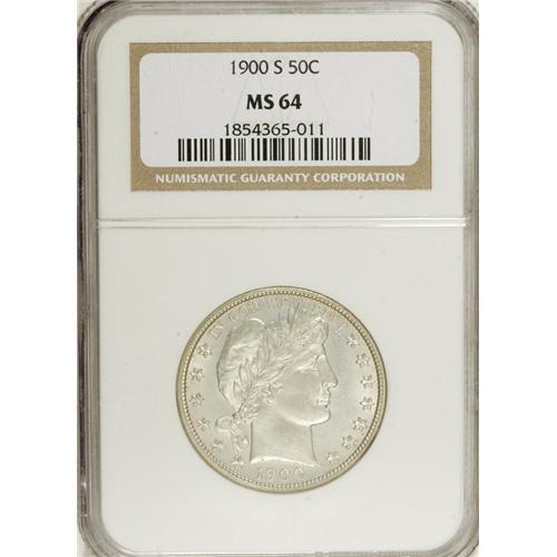 <B>1900-S 50C MS64 NGC.</B></I> The 1900-S is an underrated and scarce coin in spite of its mintage of 2.5 million pieces, especially in the better grades of Mint State. This example is from a later die state, with a prominent die cracks that connects the stars on each side of the date along the truncation of the bust. Brilliant throughout, the fields are slightly reflective. A couple of minor ticks on the cheek of Liberty prevent a Gem grade. Census: 9 in 64, 8 finer (4/07).<BR><BR><b>Shipping:</b> Coins & Currency (<a target="_blank" href="http://www.heritageauctions.com/common/shipping.php">view shipping information</a>)