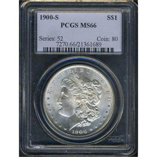 <b>1900-S Morgan Dollar. PCGS graded MS66.</b> Perhaps hundreds of specimens of this issue were present in the Redfield hoard, although there were no appreciable numbers of high grade (MS65 and better) examples that came onto the market. This is among the finest graded 1900-S gems you will see. The fields are bright with satin luster, as expected for the issue, there is no significant contrast between the fields and devices, both are creamy smooth and glowing. Sharp, but by no means completely struck up, the devices are still far and away nicer than average for 1900-S <b>(PCGS # 7270)</b>