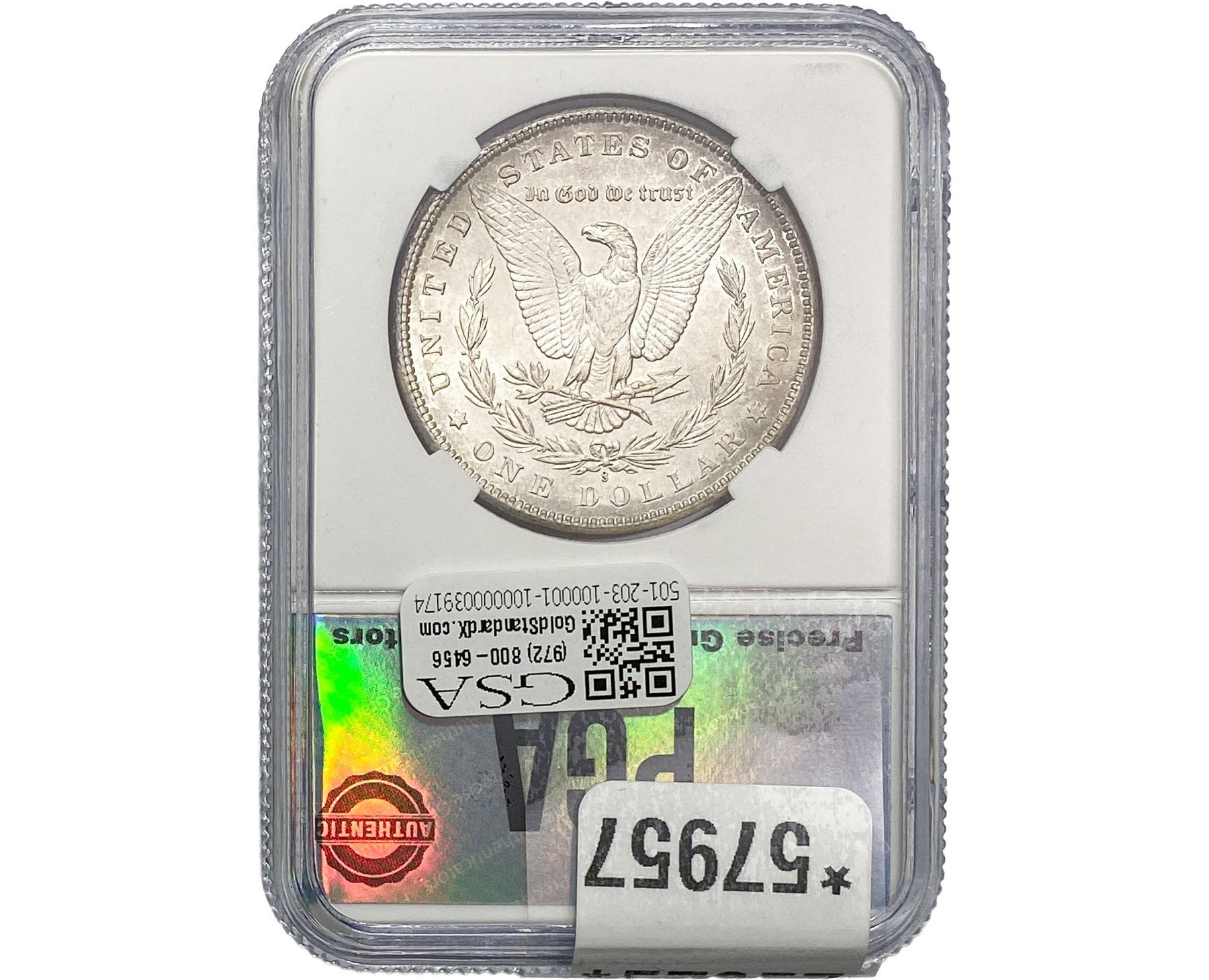 e. Coins sold referencing a third-party grading service are sold “AS IS” without any express or implied warranty, except for a guarantee by GSA that they are genuine. Removal or alteration of the holder, voids all of Bidder’s claims concerning that Product. Certain warranties may be available from the grading services and Bidders are referred to them for further details: Numismatic Guaranty Corporation (NGC), PO Box 4776, Sarasota, FL 34230, www.ngccoin.com/services/writtenguarantee.asp; Professional Coin Grading Services (PCGS), PO Box 9458, Newport Beach, CA 92658, www.pcgs.com/guarantee.html; ANACS, 6555 S. Kenton St., Ste. 303, Englewood, CO 80111; and Independent Coin Grading Co. (ICG), 7901 East Bellview, Ave., Suite 50, Englewood, CO 80111.