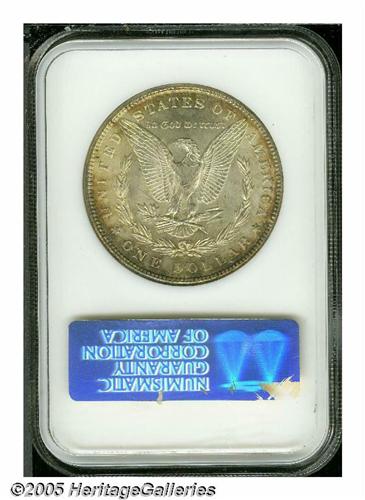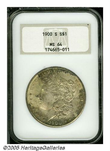 <B>1900-S<S$1> MS64 NGC.</B></I> Softly struck over the centers, with dappled, variegated patina near the borders, on obverse and reverse. There are just a few wispy marks on each side of the coin.