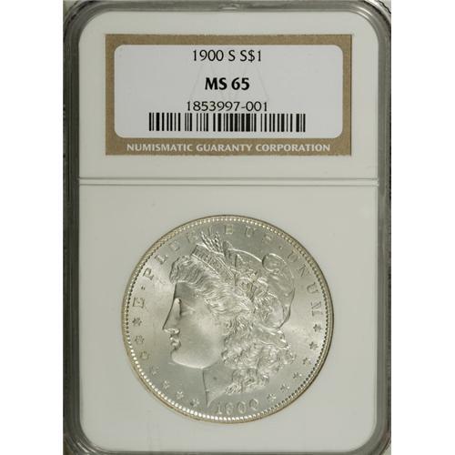 <B>1900-S S$1 MS65 NGC.</B></I> This turn-of-the-century Gem exhibits pretty luster and strong central detail. A hint of hazy iridescence graces the minimally marked fields.<BR><BR><b>Shipping:</b> Coins & Currency (<a target="_blank" href="http://www.heritageauctions.com/common/shipping.php">view shipping information</a>)