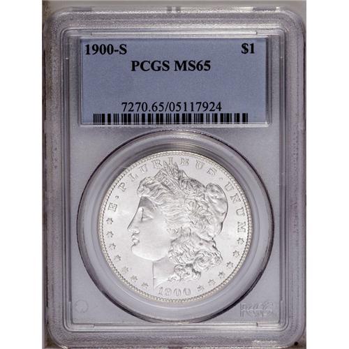 <B>1900-S<img border='0' src='http://www.heritagecoins.com/images/star.gif' width=10 height=10>$1> MS65 PCGS.</B></I> Uncommonly well struck for this scarcer turn-of-the-century issue from the San Francisco Mint and displaying a subtle, semi-reflective luster. <BR><BR><B>Important notice:</B> Heritage usually auctions material at the rate of 200-250 lots per hour. On some occasions eBay Live bid software or the Internet may not be able to keep up with the pace of the auction. We recommend placing a realistic absentee bid now as insurance to avoid disappointment. Occasionally the auctioneer may eliminate or reject an eBay Live bid, and the auctioneer may also reopen a lot after the close of the eBay live bidding (usually because we missed an audience bid), and may reject your bid even if it shows you as the winning bidder. By bidding via eBay Live, you agree that Heritage may award the lot to another bidder at its sole discretion under the circumstances described above or any other reasonable circumstances. Since eBay bids are not shown to us until we open the lot on the floor, we treat those bids just like floor bids. In most cases the floor responds before the eBay bid is presented to us, due to Internet lag time, so for consistency we have made it a policy that floor bids are always considered first over tie eBay live bids. Also please note that all Heritage lots purchased through eBay Live carry a 20% Buyer's Premium. Please make sure you read the Terms and Conditions before you bid. This lot is being auctioned in conjunction with a live floor auction by Heritage Galleries & Auctioneers. All final auction and invoice information will be supplied by Heritage Galleries & Auctioneers, and all other information should be considered preliminary. Lot:3753 <BR><BR><B>Winning Notification and Billing:</B> After the FINAL session in this auction is complete, Heritage will send e-mail and snail mail invoices. This process normally takes several days. All final auction and invoice information will be supplied by Heritage Galleries & Auctioneers, and all other information should be considered preliminary. <BR><BR>This auction will be conducted on a live auction floor and over the Internet through eBay Live. If you choose to place an absentee bid, please take a moment to <font color='#0000ff'><u><a href='http://pages.ebay.com/liveauctions/help/before/laabsentee.html'>learn how eBay Live absentee bidding works</a></u></font><font color='#000000'>