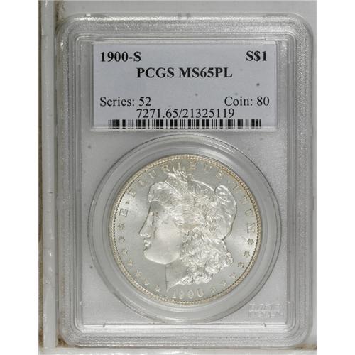 <B>1900-S S$1 MS65 Prooflike PCGS.</B></I> Another coin in this auction that at first glance could pass for a true proof. This flashy and relatively unabraded Gem has only a hint of gold color in the centers. Although the hair curl above Liberty's ear is not razor-sharp, the strike is otherwise crisp. Population: 24 in 65 Prooflike, 6 finer (4/07).<BR><BR><b>Shipping:</b> Coins & Currency (<a target="_blank" href="http://www.heritageauctions.com/common/shipping.php">view shipping information</a>)