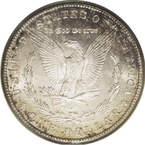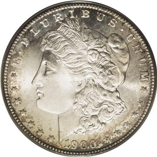 <B>1900-S<img border='0' src='http://www.heritagecoins.com/images/star.gif' width=10 height=10>$1> MS66 PCGS.</B></I> Amazingly clean and well struck for the issue, the satiny surfaces are virtually untouched by abrasions and display a rounded, clean cheek on Liberty. Both sides are adorned by mottled russet-brown and kelly-green patina near the peripheries. Diagonal roller marks (as struck) are noted on obverse and reverse, but post-striking distractions are absent. An extraordinarily attractive Premium Gem, housed in an early generation PCGS holder with a green insert. Population: 92 in 66, 1 finer (7/06).