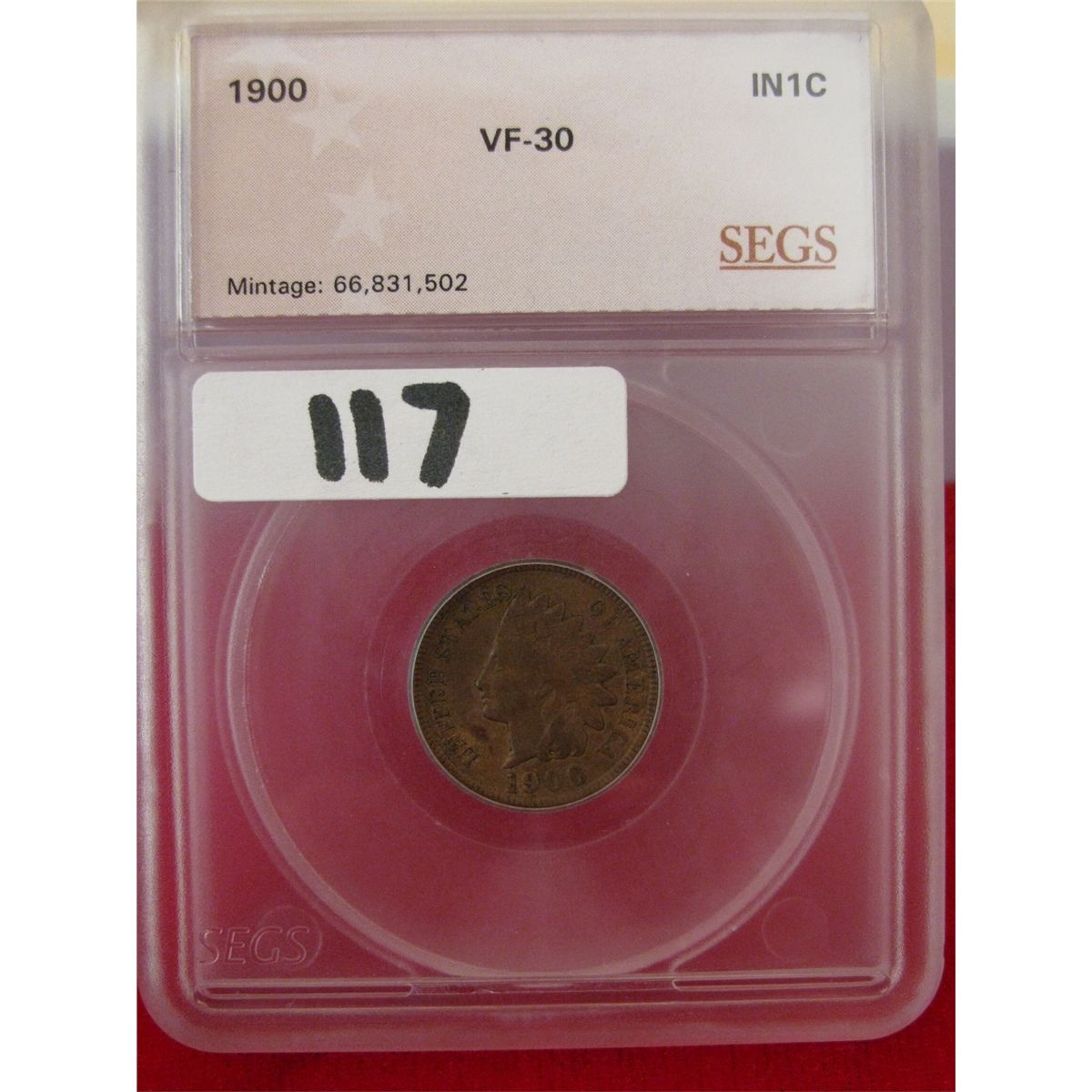 1900 Indian Head Cent. Slabbed and graded Vf-30 by SEGS.