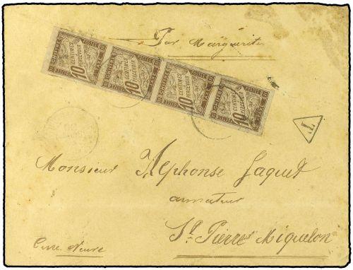 1900 Stamp-less envelope from POINTE-A-PITRE Guadeloupe sent on the steamer "Margarita" with TAX handstamp and French General Colonies postage dues 10 cents brown (strip of four) (Yvert 19) tied by ST. PIERRE & MIQUELON double ring. Rare item of commercial incoming mail.
