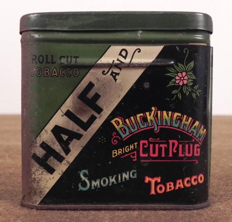 1900 TIN FROM "HALF AND" BUCKINGHAM CUT PLUG SMOKING TOBACCO * GREAT OLD TIN--FOR PIPES AND TOBACCO--STATES "NO MORE GASHED FINGERS"
