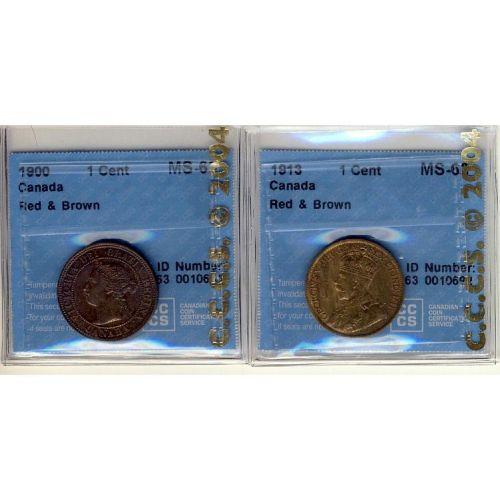 1900 and 1913 1¢ both CCCS MS-63 RB, two nice lustrous example.