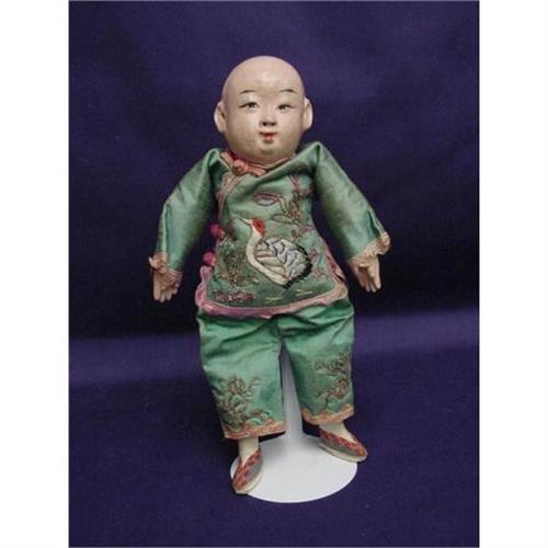 1900's China Man, Door of Hope Type, All Original. HIGH QUALITY ORIENTIAL CHINA MAN. Measures 9 1/2 inches high Fantastic turquoise green embroidered 2 piece suit Jacket closes at the side with rose color button (frogs) Embroidered bird and applied flowers on the front, back and pants. All trimmed with braid. The feet are wood and have decorated slippers. His head and hands look to be composition. His features have been painted by a talented artist. He has pierced nostrils and one pierced ear. No rubs just some age soil that we have not tried to clean, but it does not detract from this wonderful man. His body is cloth and his pants are stitched right to it. All the dolls in this collection are from the original owners family and date from 1890 to 1920.