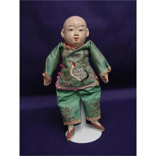 1900's China Man, Door of Hope Type, All Original. HIGH QUALITY ORIENTIAL CHINA MAN. Measures 9 1/2 inches high Fantastic turquoise green embroidered 2 piece suit Jacket closes at the side with rose color button (frogs) Embroidered bird and applied flowers on the front, back and pants. All trimmed with braid. The feet are wood and have decorated slippers. His head and hands look to be composition. His features have been painted by a talented artist. He has pierced nostrils and one pierced ear. No rubs just some age soil that we have not tried to clean, but it does not detract from this wonderful man. His body is cloth and his pants are stitched right to it. All the dolls in this collection are from the original owners family and date from 1890 to 1920. [80000375y