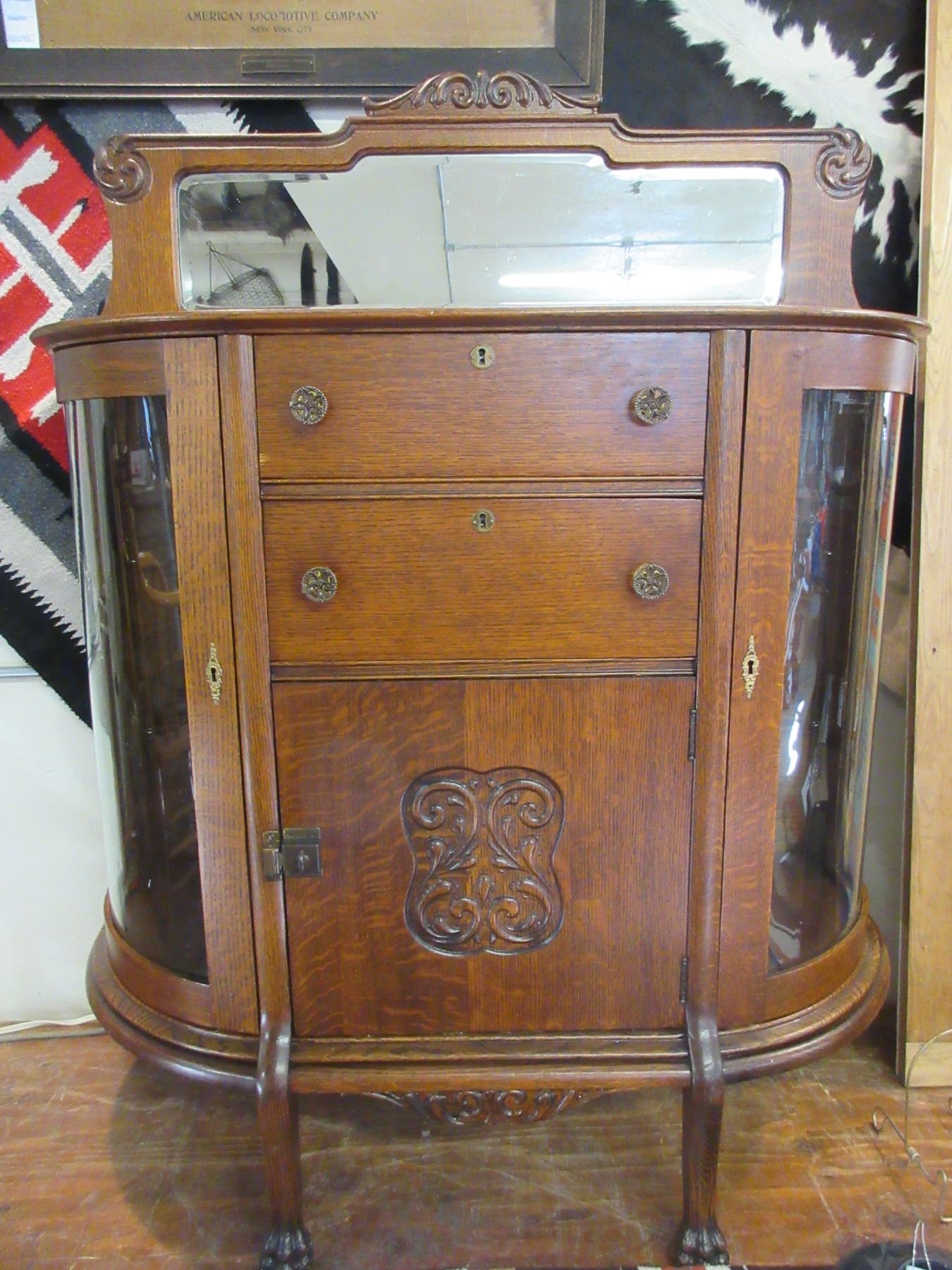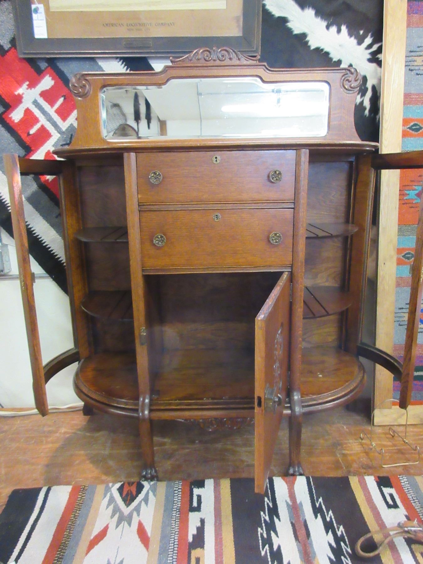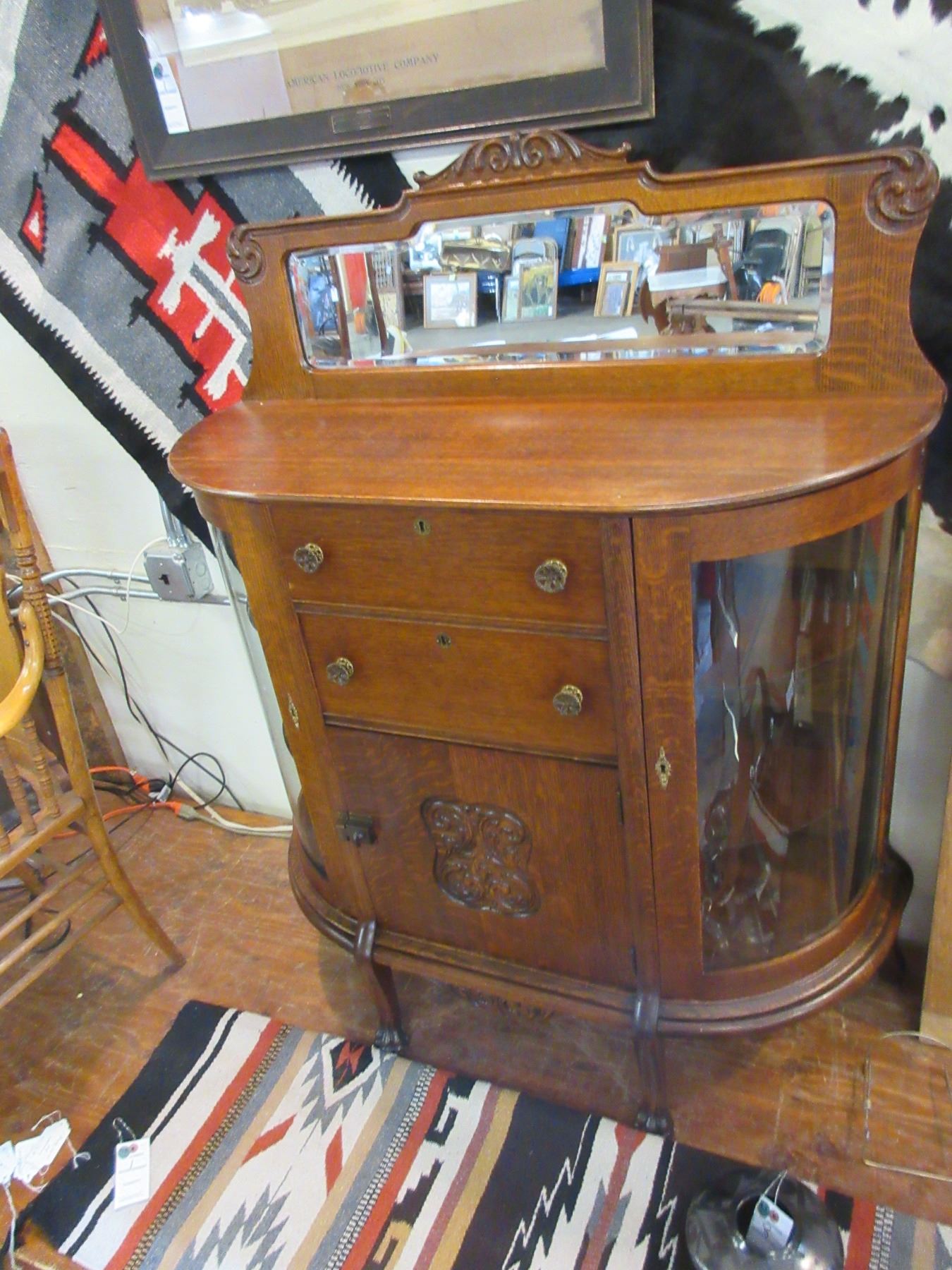1900's Curved Glass Carved Oak Server- Beveled Mirror Back Splash- All Original- Great Condition