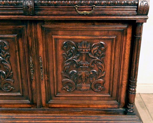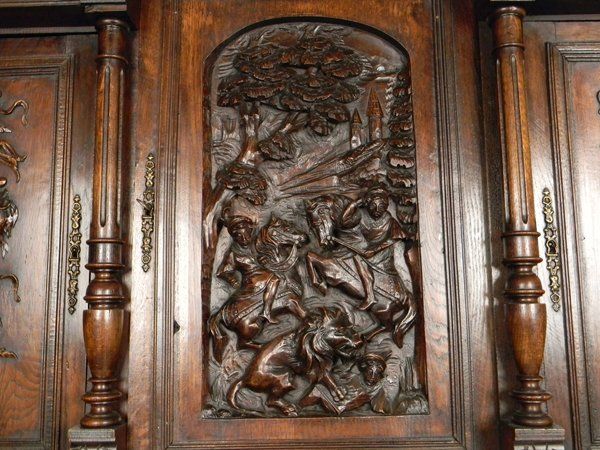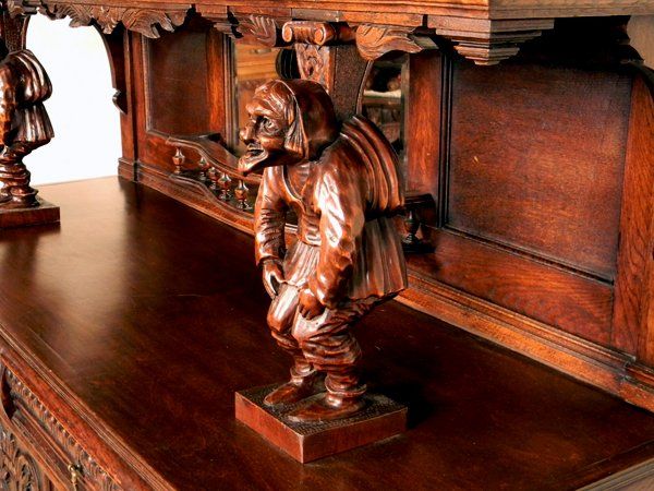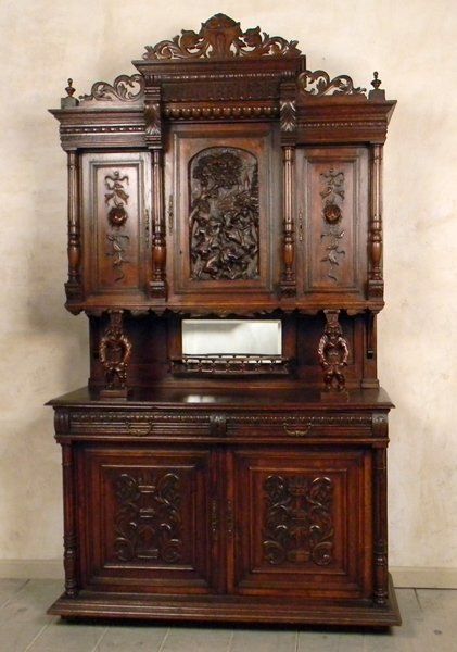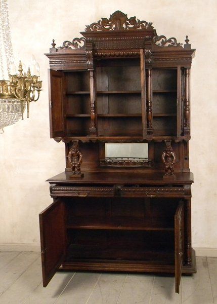 1900?s French Henry II style Buffet. Renaissance style carvings. Two doors on bottom concealing two shelves. Two drawers. Brass handles. Beautiful center display with beveled mirror. Top piece has three doors. Middle door is carved with a battle scene. Amazing carved hunchbacked figures separating top and bottom. 103x58x21 inches