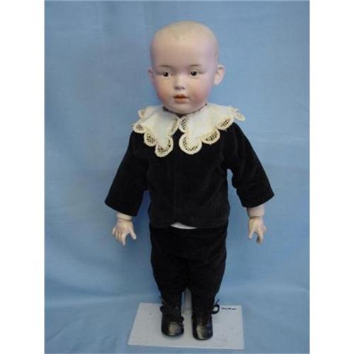1900's Gebruder Heubach Victorian 17in Pouty #7,Excellent. Fantastic pouty boy marked #7 Germany in the back with bisque head and composition body. The head has rosy complexion, intaglio blue eyes, molded and painted hair, smiling mouth with tiny teeth and is in excellent condition with no hairlines, damages or repairs. The composition body is in very good condition with the original paint. He wears a velvet suit with old lace collar, that could be his original clothing. This is a great doll to be treasured and cherished. [80000421]