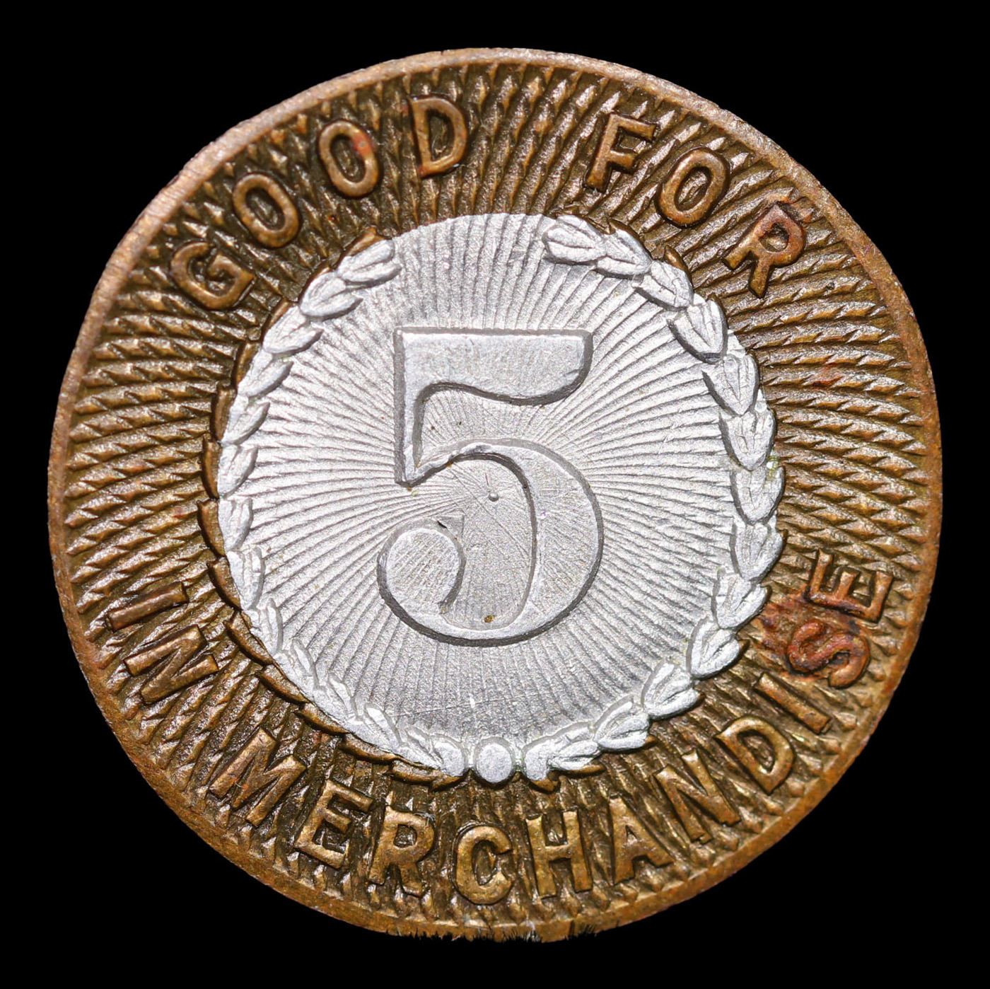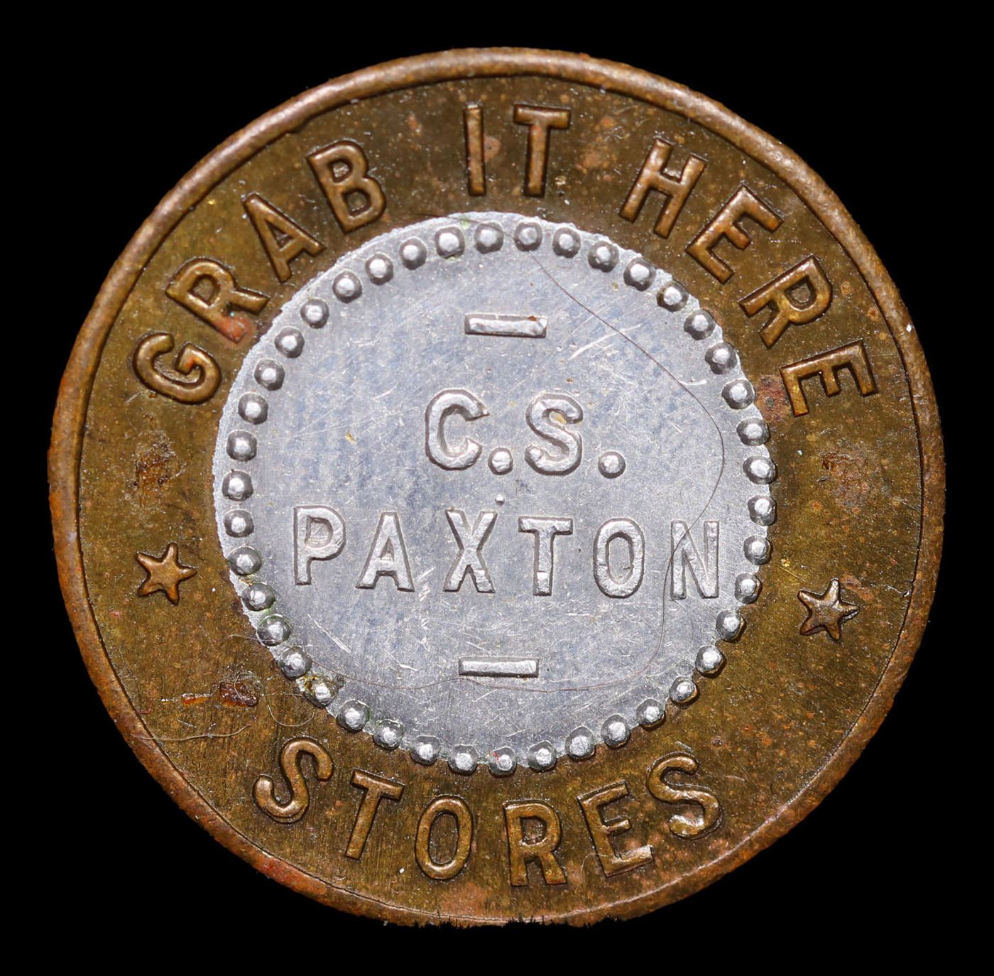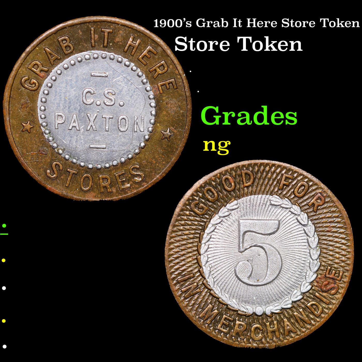 1900's Grab It Here Store Token Grades NG. Grab It Here was a chain of cash and carry stores that existed from 1903 to the end of the 20th century in Illinois and Indiana. This Token was distributed in Danville, IL at one of Grab It Here's 7 locations.C. Sherman Paxton moved to Illinois from Kentucky as a coal miner around 1901. He began saving money to open his own grocery store. By 1903, he had saved $185 (5579 in modern terms) and opened a small store in Georgetown, Illinois. The store was originally called simply the "C. S. Paxton Store", and he ran it on credit and made deliveries; Paxton closed the store for a time during a coal strike but returned later and opened the store again.In 1919, Paxton opened a cash-only store managed by his son Ernie and it was here that the "Grab-It-Here" name first appeared. By the 1930s, there were several cash and carry stores in operation. By 1941, that grew to a chain of 40 stores. In 1968, Grab-It-Here became affiliated with Dolly Madison Industries. By the 1980s, the chain was defunct.