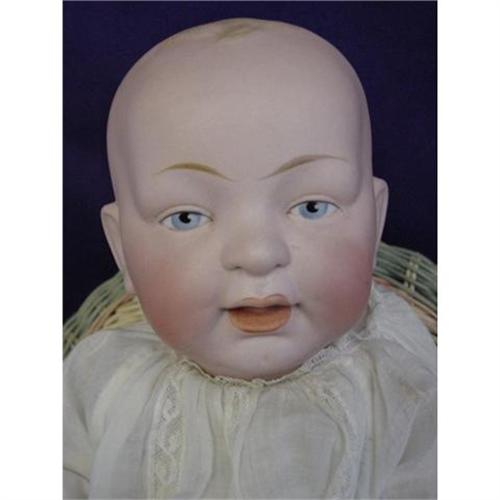 1900's JD Kestner 17in SAMMY Character Baby, Excellent condition. Beautiful Sammy has painted blue eyes that sparkle, open mouth, rosy complexion, and one stroke eyebrows. Head is bisque in excellent condition with no hairlines, damages, or repairs. Body is composition in very good condition with all fingers and toes. He wears an antique baby gown of fine cotton and lace. Sweet Sammy is gorgeous and a great addition to any doll collection! [80000309]