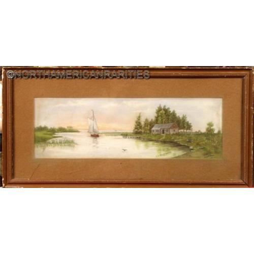 Nicely done pastel depicting a lake landscape with old house and sail boat. <p> Framed in 14" x 28" wood frame, matted under glass. Signed in pastel lower right.
