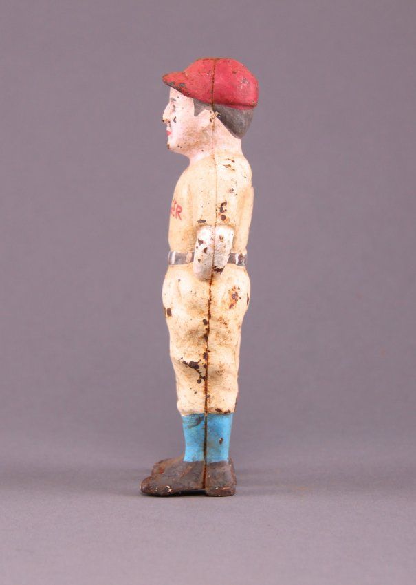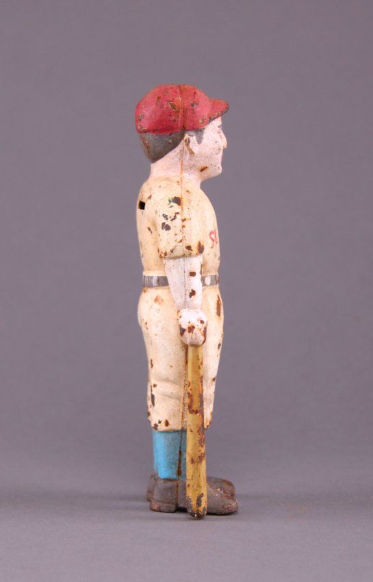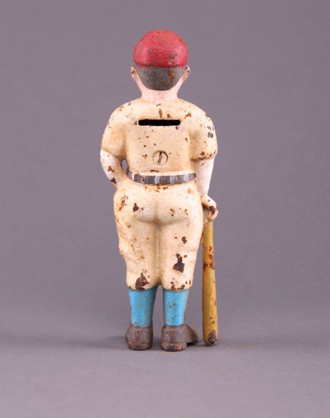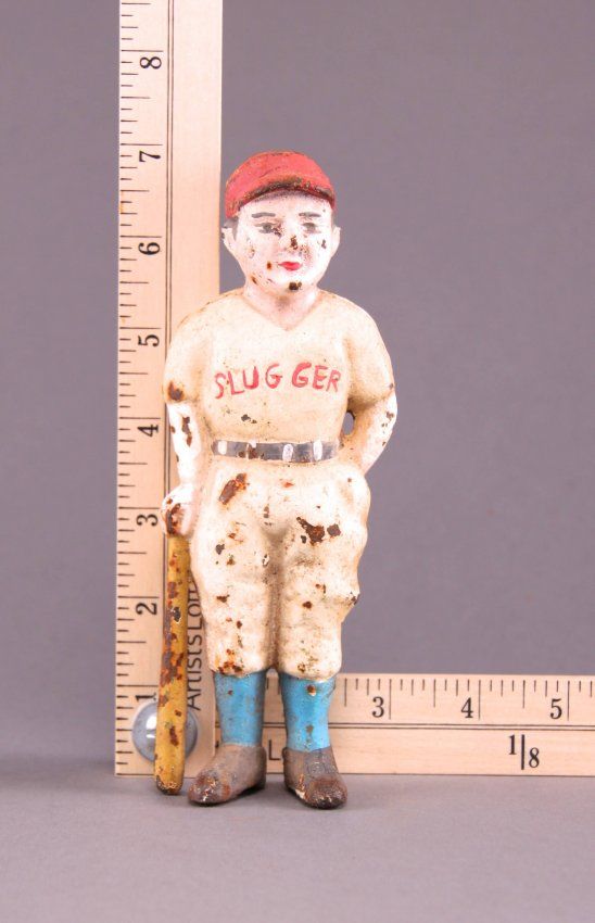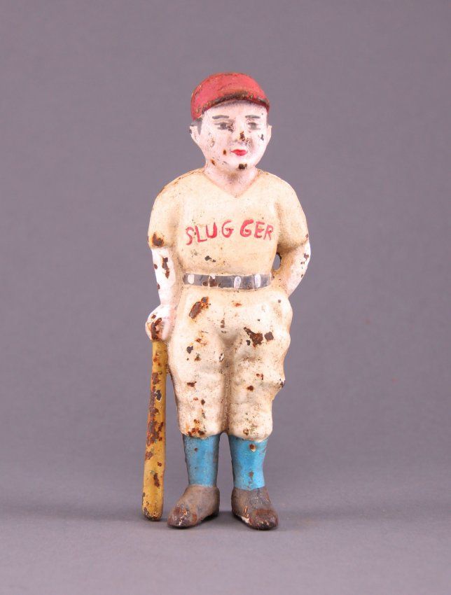 1900's "Slugger" cast iron Baseball Bank. This colorful bank exhibits some rust and paint chipping. It features a baseball player in uniform holding a bat with the word "SLUGGER" across his chest. Coins may be deposited through a slot in the back. A rare, very desirable item. (Size: See last photo for measurement.) Photos are part of the description representing the condition report. Pangaea Auctions urges Bidder's to view all attached photos.