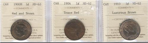 1900H, 1904 & 1910 1¢. Lot of 3 coins all ICCS certified. The 1900h grades MS63RB and the other two dates grade MS62. All coins show great lustre and no negative comments.