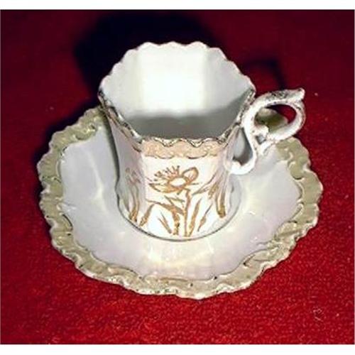 These miniature toy-size cup and saucers were originally made to collect and display in a cabinet. They were also to teach manners and social graces to the children of wealthy families. I believe it is probably from the early 1900s and in excellent condition. It is porcelain with handpainted gold trim and flowers. The trim at the top of the cup and the edge of the saucer is a pale yellowish green and looks like it has mother of pearl over it. The saucer is 4" round and the cup is 2" high and 2" wide at the top of the cup not measuring the handle. The handle is very fancy.