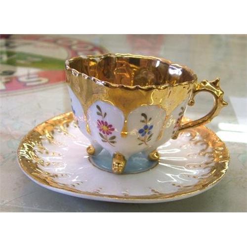 These miniature toy-size cup and saucers were originally made to collect and display in a cabinet. They were also to teach manners and social graces to the children of wealthy families. I believe it is probably from the early 1900s. This is a very dainty miniature toy-size cup and saucer. The cup and the saucer are six sided. The cup has an unusual handle and has four little feet. There is some wear on the gold of the handle and a few places on the saucer that looks like wear but I think it was made that way. There are no chips or cracks. The saucer is 3 1/2" and the cup is not quite 2" tall. A lot of people are not familiar with the miniature toy-size cups and saucers. You can get more information from the Collectible Cups and Saucers Identification and Values books by Jim and Susan Harran. I have Book I thru III.