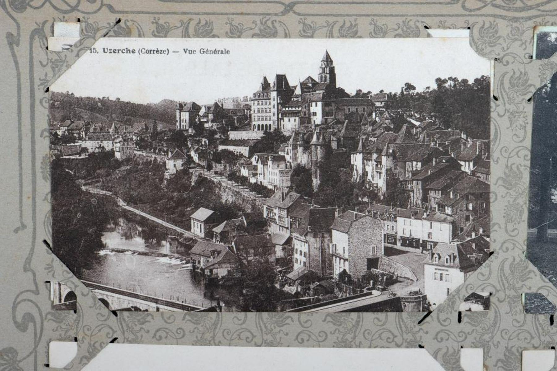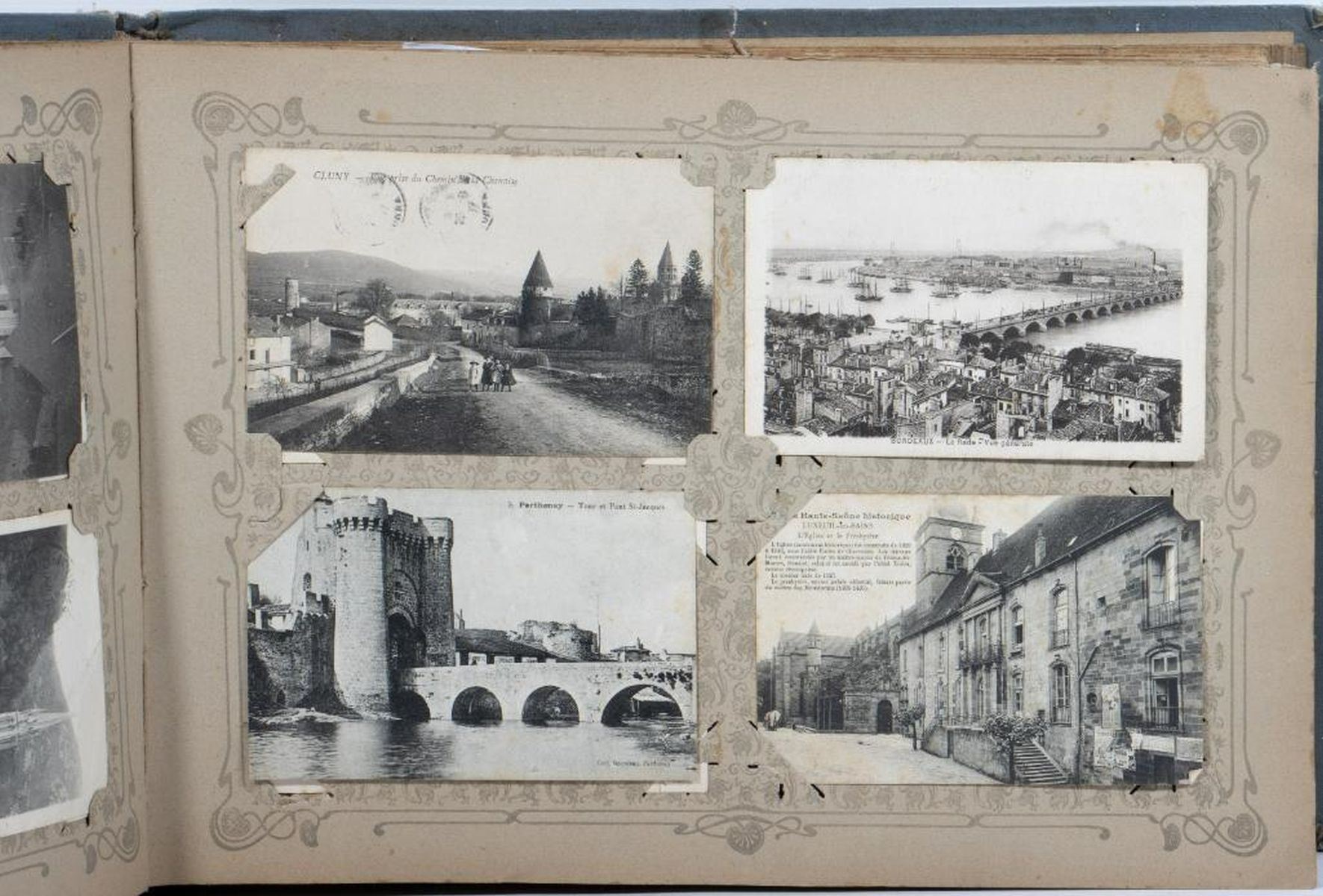 A partially filled French postcard album. Light blue cloth, hand-painted floral design with embossed "Cartes Postales" and Art Nouveau decoration. There are about 31 mostly full leaves of 1900s postcards (approx. 200+ cards total), plus empty pages. The leaves have a gray printed design. There are several photo postcards of individuals, but most are Paris and other views of France, numerous chateaux, and the Alps. Includes B. F. Chalon & Saon and Hachette et. Cie. Most are unused, but several are stamped/franked and/or written on. The album cloth has wear and staining, but binding is sound; some soiling, staining; postcards are in good condition, some with light foxing. 10 1/2" x 15 1/4".