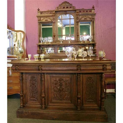 French Walnut Custom Neo-Renaissance Bar Hand-Crafted From Antique Furniture. All decorative trim pieces are from antique buffets. The structural elements are new wood, the mirrors are new and the counter is new copper. There is room to install a sink and small refrigerator under the counter on the front of the bar, while the back bar has shelves to hold glasses and bottles. A unique conversation piece! Please refer to photos or contact us for further information. At EuroLux, our customer's happiness is our top priority. For this reason, we go to great lengths to fully, honestly and accurately describe our pieces. As we hand-select all of our pieces personally, we only buy high-quality items. However, please keep in mind that there is no such thing as a new antique or vintage item, and normal wear associated with these items is to be expected.