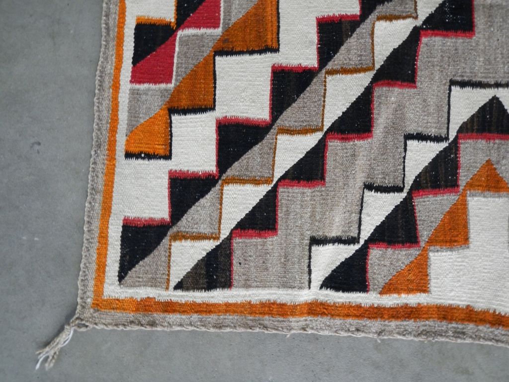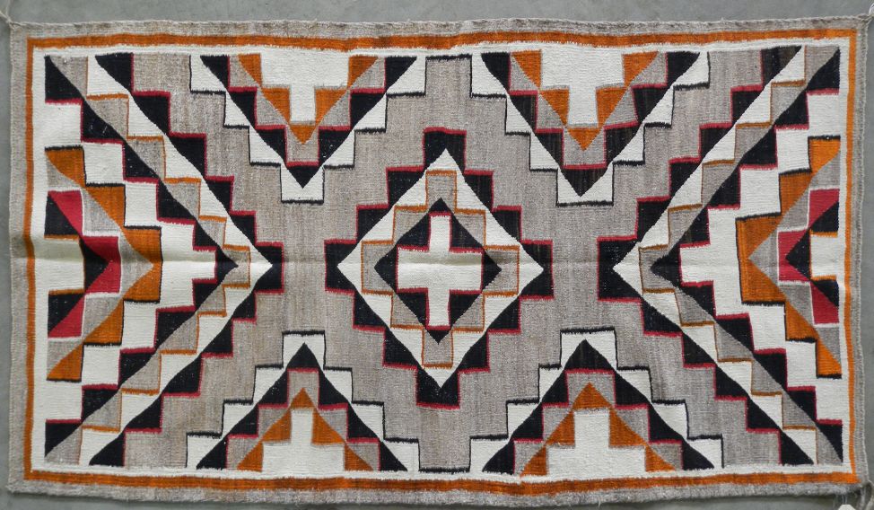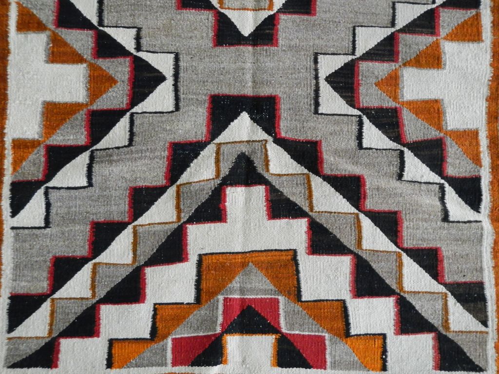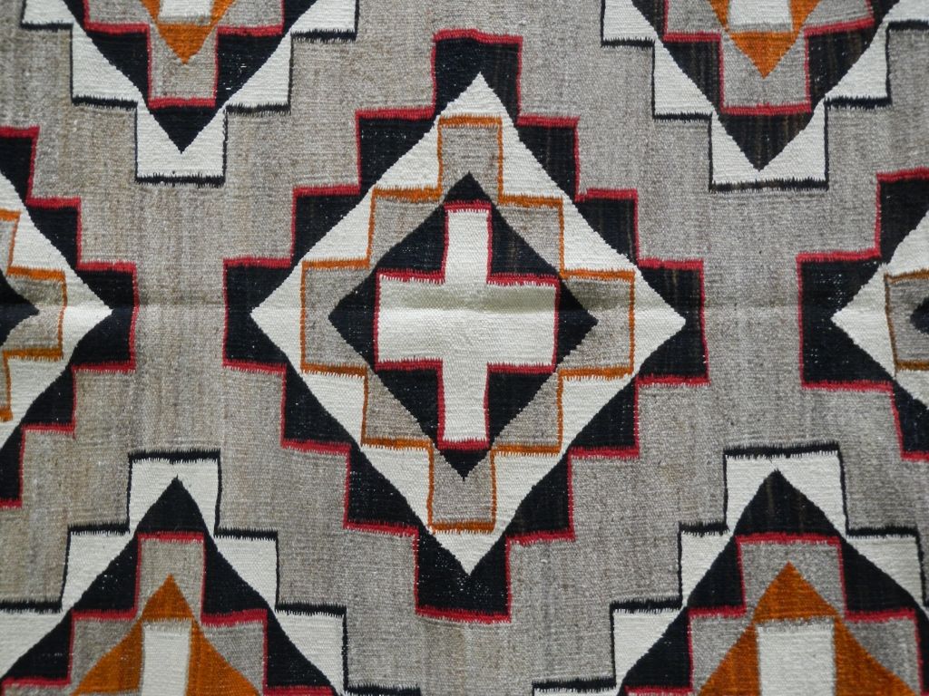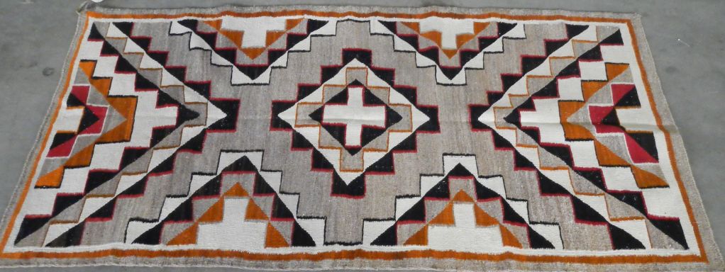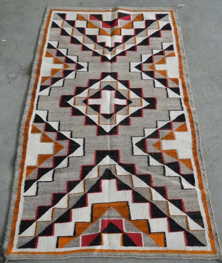 1900s Genuine Diamonds and Cruces Navajo Throw Rug This rug has the Diamonds and Cruces pattern and is in Mint Condition. Made with 100% Wool Hand Woven and Traditional Navajo Dyes. 400 Years ago the Spanish Missionaries came over and taught the Navajo Tribes to hand Weave and dye these rugs and are still continuing this practice today. This is an Authentic Navajo Throw rug from 1900-1920. Size is