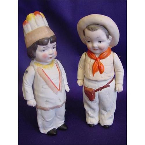1900's Hertwig Bisque 7in Pair of Cowboy and Indian, Germany. this is a pair of frozen bisque figures, they only move their arms. They both are in good condition but both have a slight hairline in the back of their hats. Hairline is on top of surface, doesnot go through. These are a cute pair and hard to find the 2 together. A nice addition to your vintage doll collection.. (Item #80000348)