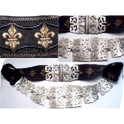 What an amazing piece of fashion history this is! You don't usually see the buckles with the belt but this one has it and it a BEAUTY! The black belt has golden fleur de lis woven into the design as well as raised lace designs. The black of most of the pieces are marked and they are heavy and thick and in great condition. The belt can be worn with the clasp in the back or the front giving it a totally different look. If hooked in the front you have 10 inches of silver panels with the widest being 2 1/2". THe front panels are 2" each ( 4" when closed and connected). This is so much nicer than the photos and is a really gorgeous piece of history. This is a really good quality piece that has been well taken care of after all these years. I hope it gets a great home. Each piece that is marked has EPNS stamped into it. The length when closed is 26 1/2". Each of the woven pieces are hand sewn onto the belt buckles and links.